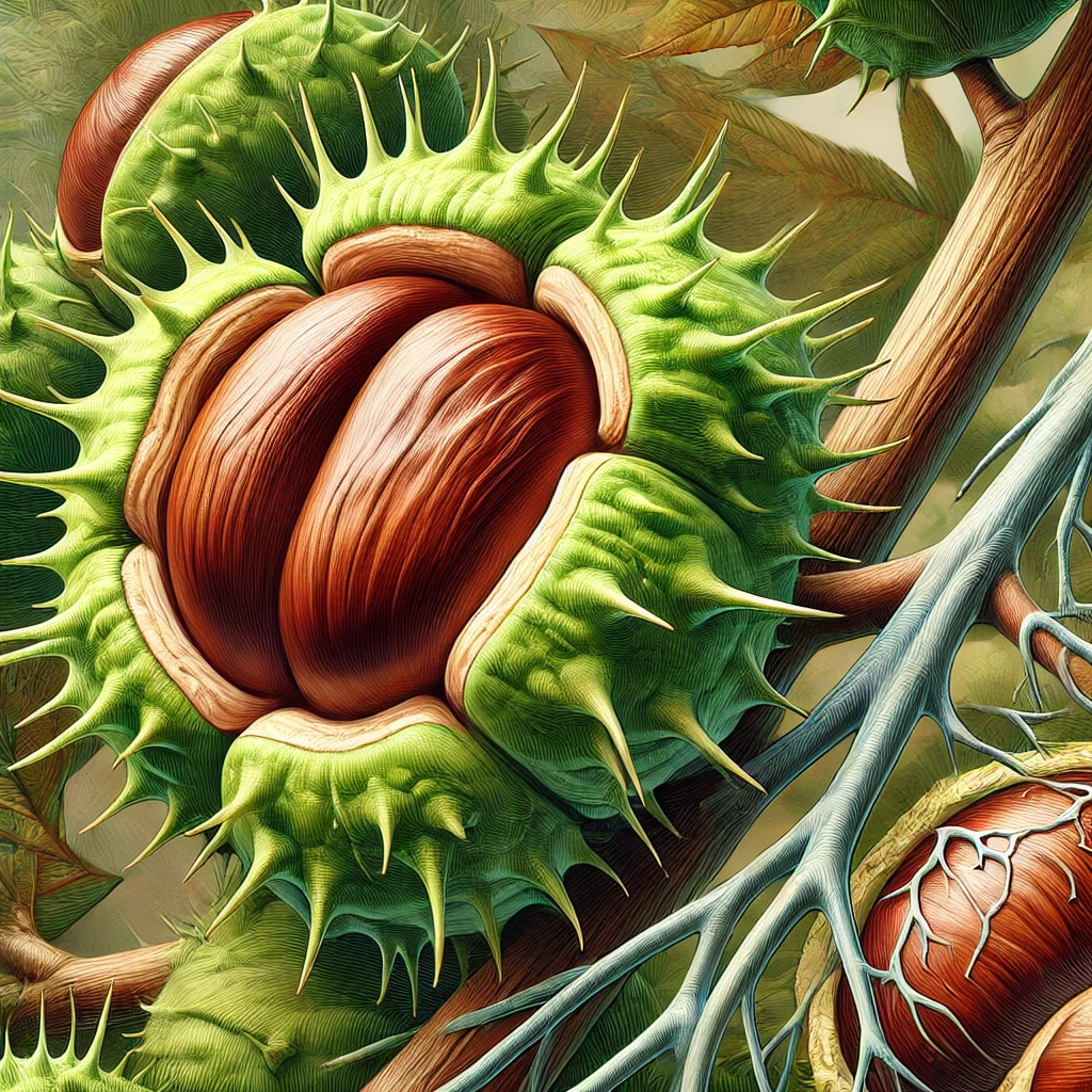Le marronnier d’Inde est une sentinelle des veines, un gardien vigilant du flux vital. À travers son fruit lisse et brillant, il insuffle force et tonicité aux vaisseaux, veillant sur la fluidité du sang comme un fleuve aux courants maîtrisés.